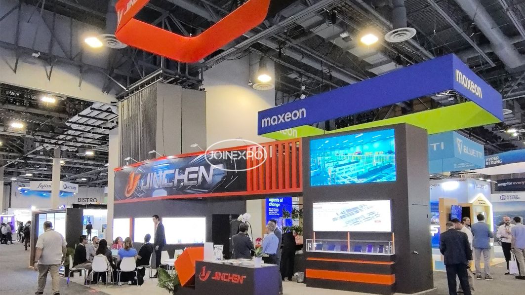 RE+ 2025展會現場,參觀者們穿梭在各個展臺之間,參與產品演示和技術交流。