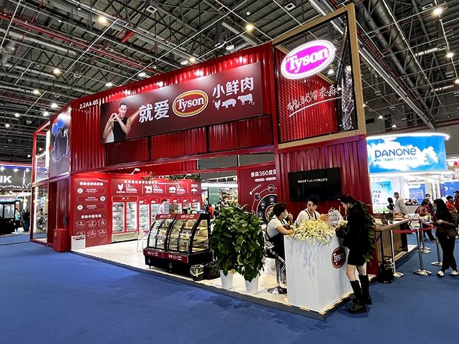 上圖:泰森展臺(tái)的設(shè)計(jì)以LOGO色紅色為主色調(diào),黑色為輔助色,體現(xiàn)泰森品牌調(diào)性